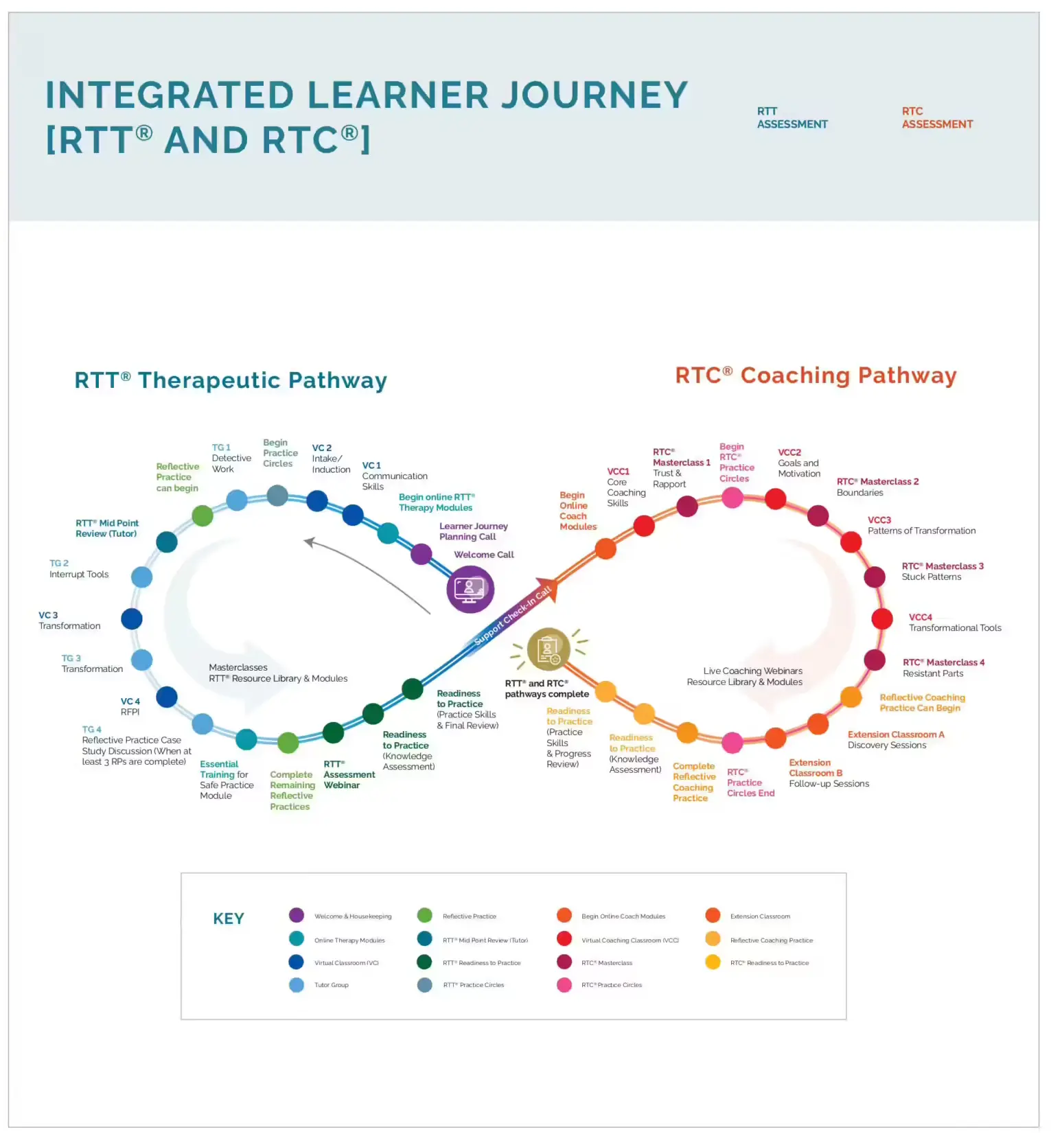 A blended learning course comprising self-paced online study and live virtual training. This is Phase 2 of your RTT® Integrated business partnership, which teaches you advanced coaching skills to help clients reach their goals at the conscious